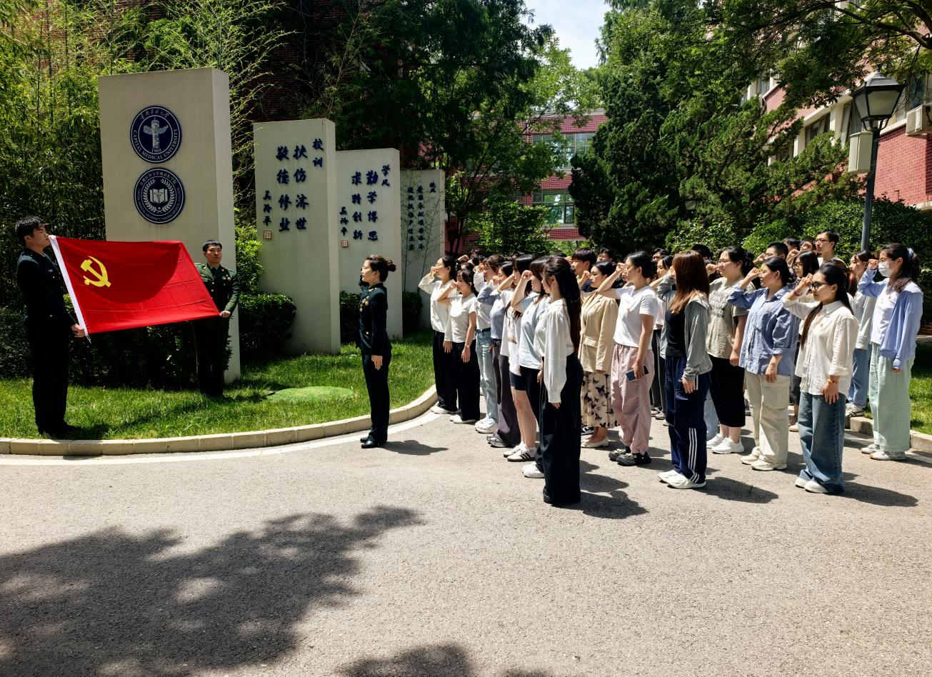 活动最后,由退伍大学生党员赵若凯和薛京硕执党旗,冯晨阳领誓,学生党支部组织全体新发展党员和转正党员庄严宣誓,本次主题党日活动在铿锵有力的入党誓词中圆满完成。支部计划后续深入周边社区开展卫生健康服务,进一步将优良作风从认知转化为行动,锤炼“艰苦奋斗”的意志,努力做守护人民健康的忠诚卫士。