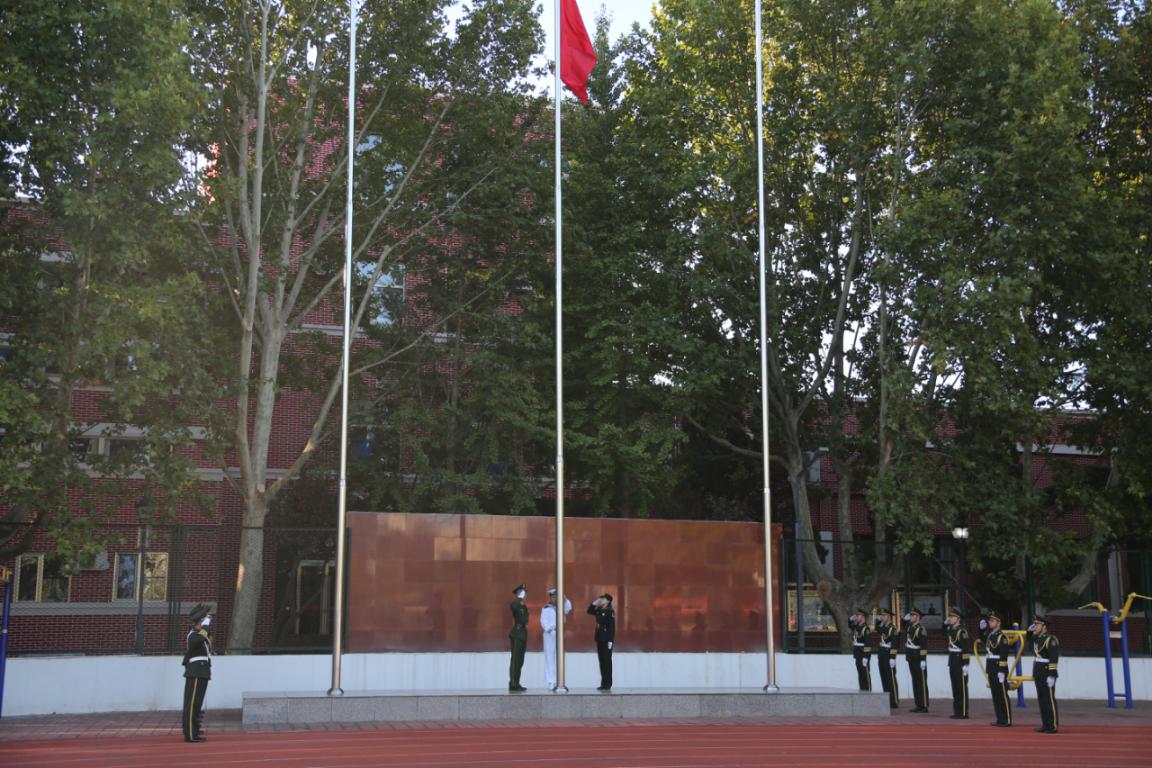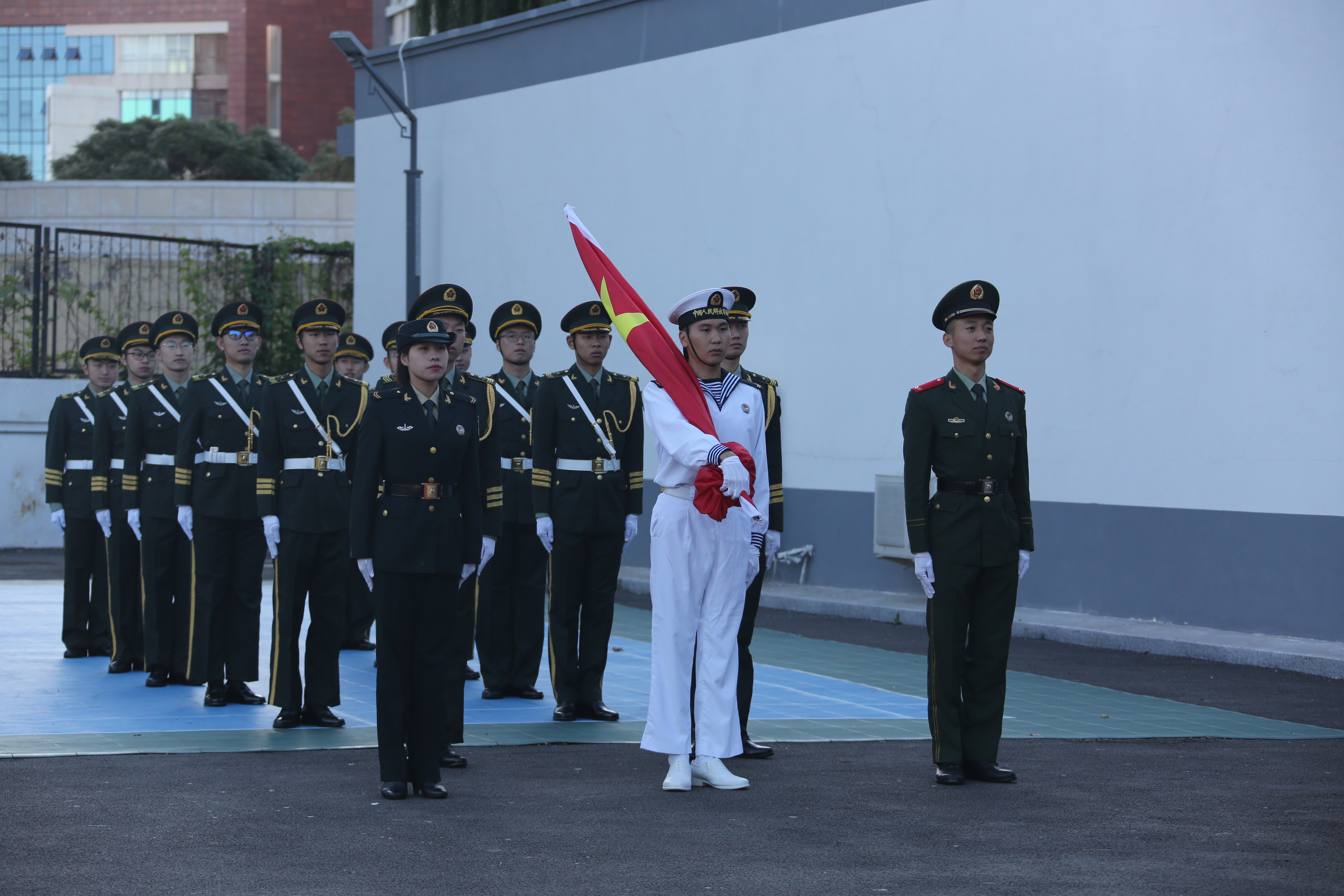10月8日,wepoker德州 2019级全体军训学生在操场举行升国旗仪式。wepoker德州 党委书记吴兵、院长杨红、党委副书记、军训团副政委崔群颖、军训团其他教师和610余名大一新生共同参加了升国旗仪式。