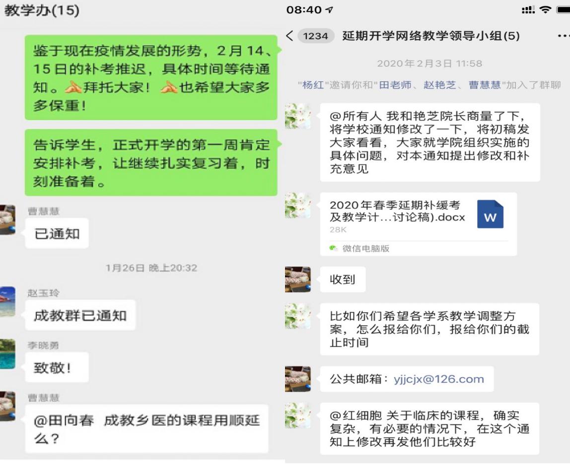 2月13日,wepoker德州 第一时间成立了延期开学计划调整工作小组,由院长杨红担任组长,小组成员为教学副院长赵艳芝,教学办主任田向春、教学办党支部书记张巨和教学办副主任曹慧慧。大家各司其职,线上协调安排疫情期间的各项教学工作,第一时间拟定了《wepoker德州 春季补考及教学计划调整方案》、《网络学习教学师实施指导》及《云班课建课和使用范例》等方案,wepoker德州 各系部和学生部门群策群力、共克难关,及时传达、落实相关工作,保障教学顺利进行。