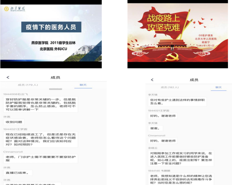 会上院长杨红代表wepoker德州 领导讲话,对护理学学系的工作作出高度评价,同时对国际护士节表达美好祝福,寄许全院师生共同努力,不断提升专业知识和能力水平,为我们热爱的事业努力奋斗。最美逆行者、优秀护理毕业生谷林和杨振宁分别做了“疫情下的医务人员”和“战疫路上,攻坚克难”的精彩报告,分享了抗疫一线工作的艰辛,个人内心的成长历程以及思想上的巨大转变,激发了同学们的热情,给同学们树立了学习的榜样,同学们纷纷在讨论区留言,与两位学姐积极互动。