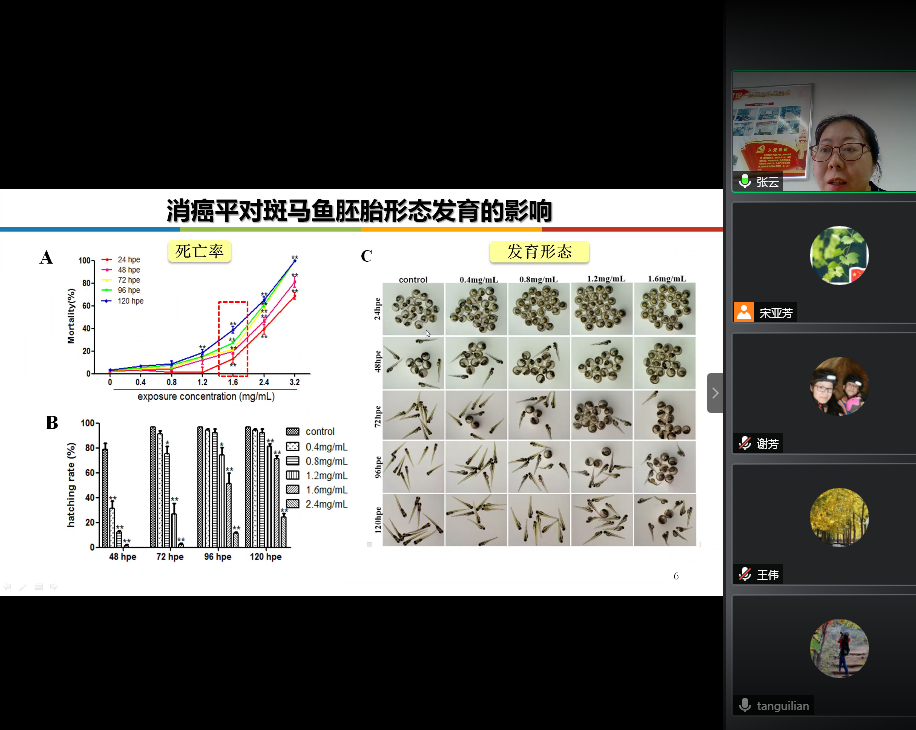 张云研究员讲到,在新药早期安全性评价领域,斑马鱼实验模型安全性评价体系具有灵敏、可靠、快速、准确、高通量、成功率高等优势,可以提高新药研发的效率和安全性,降低新药研发的成本,从而更好地推动药物研发进程。在药物活性筛选方面,张云研究员介绍了抗肿瘤、抗血栓、心脏保护、抗炎、抗氧化、促血管生成等方面研究的模型;此外,还就毒性评价中的一般毒性、发育毒性、神经毒性、器官毒性(心脏毒性、肝毒性、肾脏毒性、胃肠毒性、耳毒性等)和生殖毒性等方面研究,进行了精彩分享。最后,以消癌平对斑马鱼胚胎形态发育的影响、PM2.5水溶性成分对斑马鱼幼鱼脑血管危害为例,对新药早期安全性评价与化学物质毒性评价实验研究进行了全方解读。