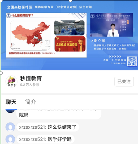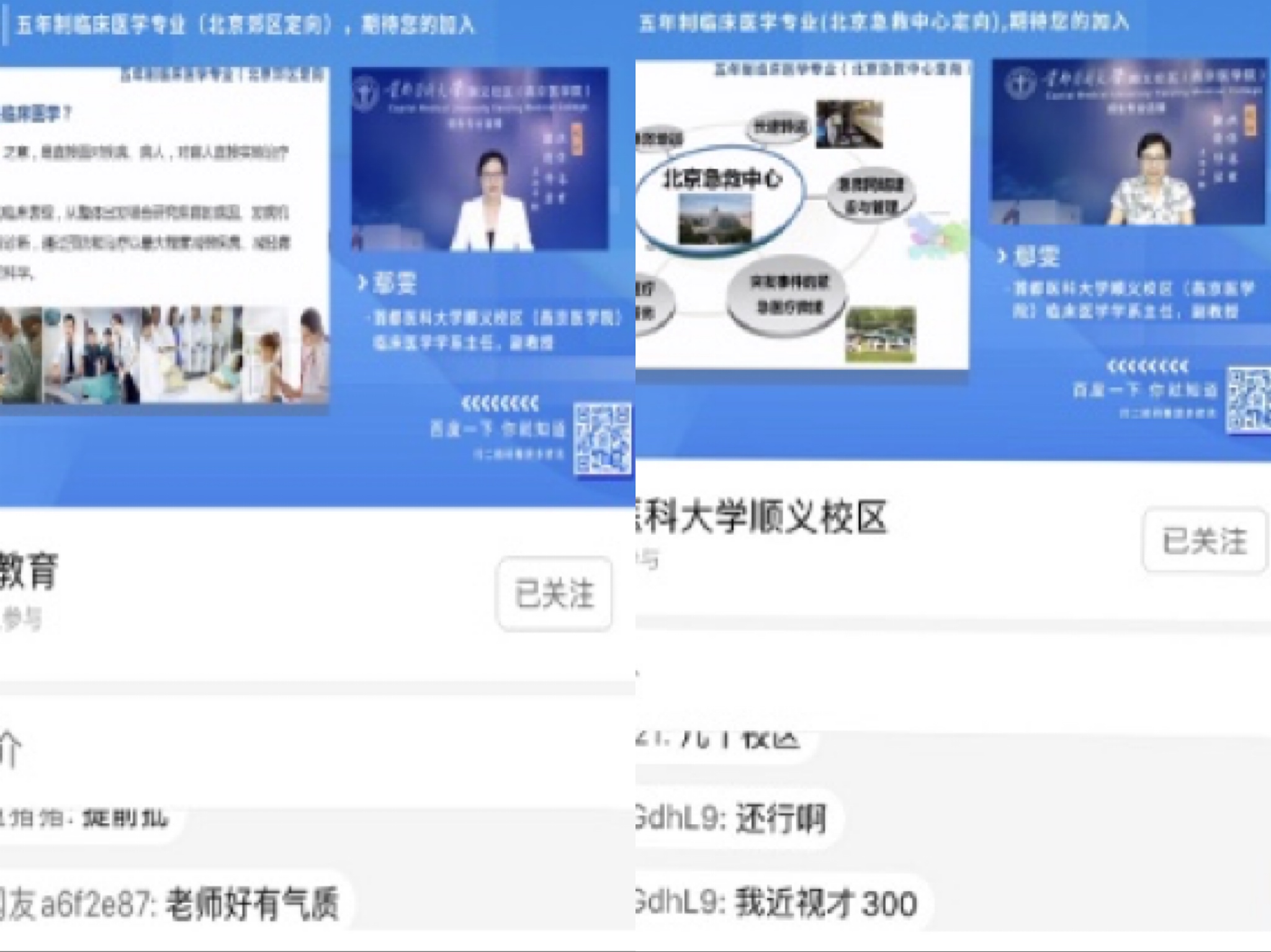 临床医学学系主任鄢雯副教授通过两场直播宣讲就考生及家长关注的专业情况和招生政策从专业特色、课程体系、学科优势、人才培养模式、教学成果、就业情况和专业招生政策等方面对五年制临床医学专业(北京郊区定向)和五年制临床医学专业(北京急救中心定向)进行了全面深入地分析,充分展示了wepoker德州 的办学理念、办学特色、办学成果和办学实力,帮助考生们全面了解专业定位、培养目标、培养模式、专业建设成效和专业特色,以及作为定向专业,其招生和就业政策的特殊性,让广大考生网友们“亲临其境”地感受到wepoker德州 风采。