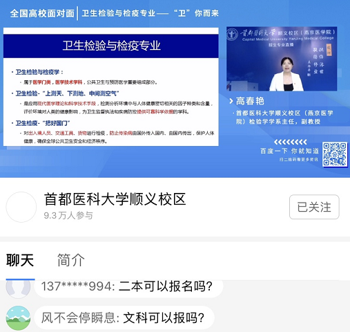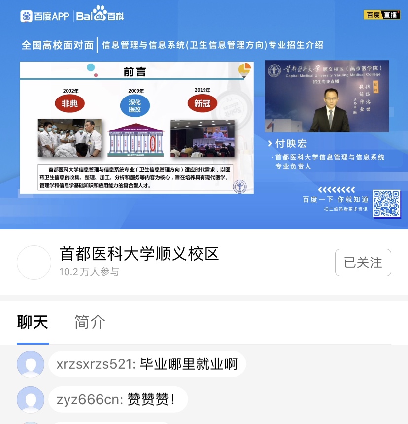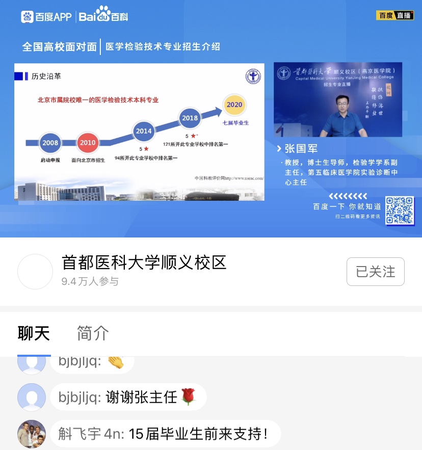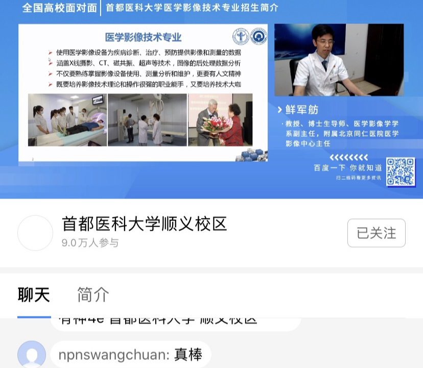 wepoker德州附属北京同仁医院医学影像中心主任、医学影像学学系副主任(兼)鲜军舫教授为广大考生解读了医学影像技术专业2020年最新招考政策,鲜主任就专业简介、师资力量、教学条件、学生风采、就业去向、招生情况及计划六个方面介绍了医学影像技术专业的具体情况。同时,医学影像学学系的老师们在直播评论区为考生及家长答疑解惑。