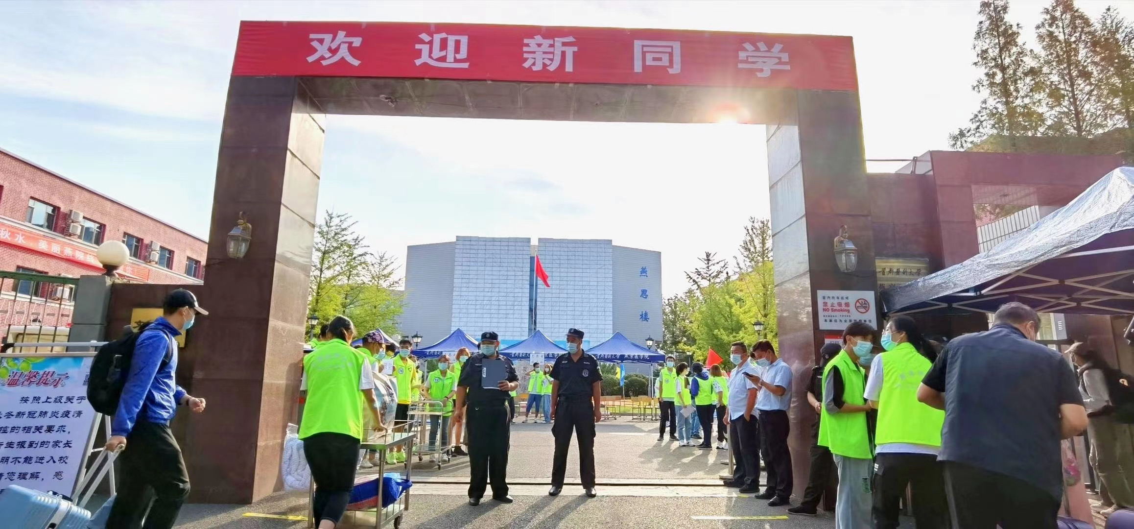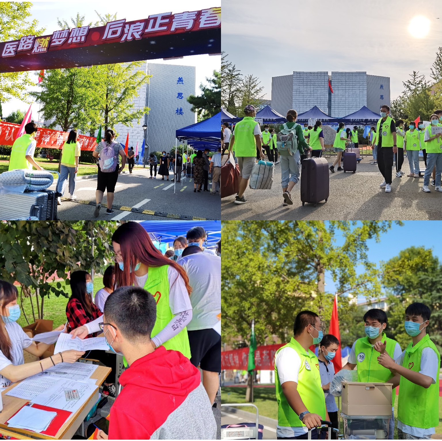 考虑到疫情防控的要求,送新生的家长不能入校,迎新现场的学生志愿者们身着绿马甲,化身“小超人”,穿梭在校园各个角落,帮助引导、搬运行李,全流程、不间断地为新生们送去最贴心的服务和最暖心的关怀。