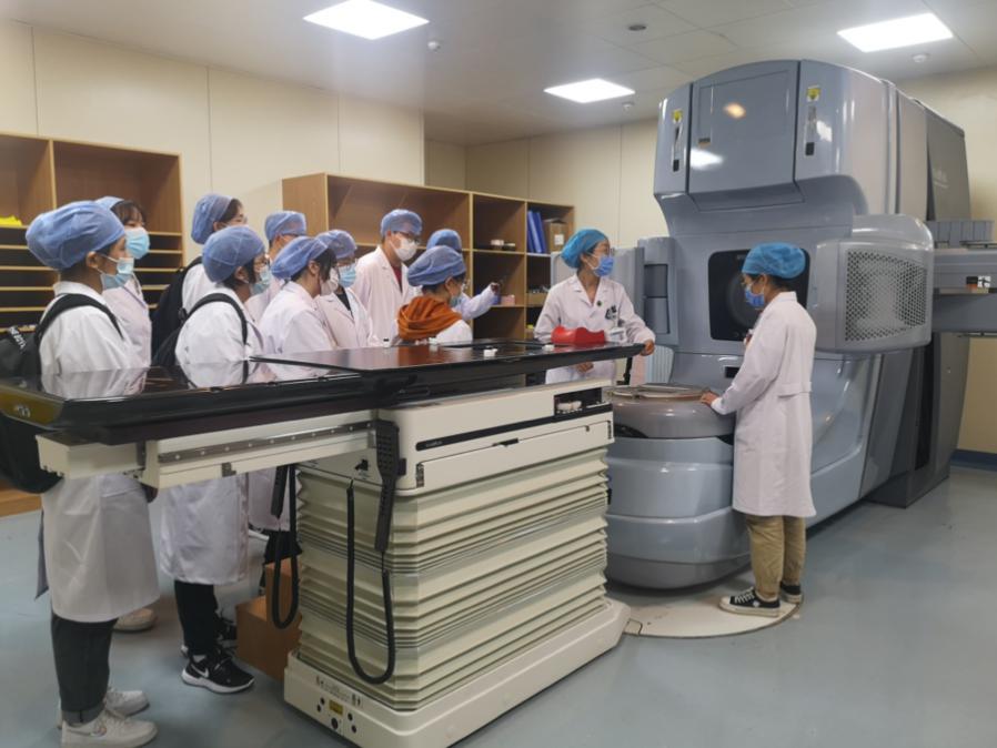 本次见习涉及CT、MR、核医学、普放、放疗等相关的影像设备观摩,43名学生分成5组进行轮转。临床带教老师首先向同学们讲解影像设备等相关专业知识,随后带领大家参观各个放射科室的操作间、办公室等工作场所,使同学们对医学影像技术工作的临床工作范畴及今后工作的环境有了初步的认识。在讲解中,带教老师着重介绍了各种影像设备的具体成像原理、内部结构、操作方法与影像质量的控制,并演示了医院病人检查的实际操作流程,呈现出医学影像技术工作人员真实的工作状态,让同学们对未来将从事的职业有了更多的体会。