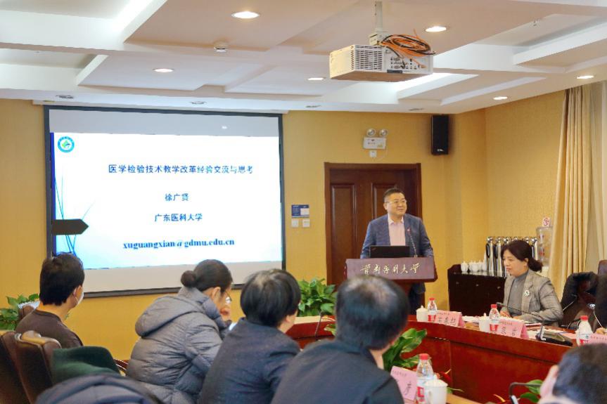 现广东医科大学徐广贤教授(原宁夏医科大学检验wepoker德州 院长),分享了宁夏医科大学医学检验技术一流专业建设中的经验,包括在医学检验模拟实验室建设,数字化、网络化教学资源库建设,双师型师资队伍建设,“二强、六化、一产出”的实践教学模式等方面的教育教学改革经验和思考,并提出新冠疫情冲击和新医科背景下专业人才培养的矛盾所在和可行的应对策略。