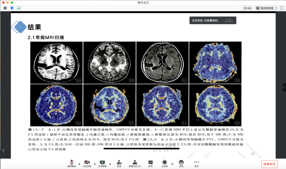 首次线上讨论于1月30日进行,学生们分为4个小组,每个小组负责一种MR序列,经过论文检索以及汇总后,各组对序列的基本原理、应用等进行了汇报。2月9日下午,第二次讨论会如期召开,分别对《DTI对糖尿病三叉神经痛的诊断价值》、《磁共振DKI对痉挛偏瘫型脑瘫患儿的临床应用》、《双标记延迟时间3D-ASL对急性脑梗取栓前后脑血流动力学的评估价值》、《正常人脑皮层下灰质核团定量磁敏感成像的可重复性分析》四篇论文进行论文研读汇报。学系特别邀请了北京天坛医院丁金立老师参会,丁老师对每个小组的汇报进行点评和指导,为同学们指出了不同序列目前的可研究方向,并且表扬了同学们对于此项活动的认真态度,也鼓励同学们日后参与更多的科研课题。学系主任胡玲静对汇报中出现的PPT撰写问题、语言表达不严谨问题、以及不规范科研撰写予以纠正。
