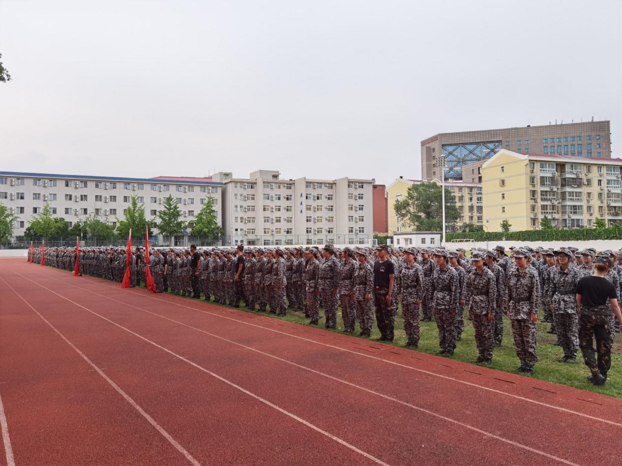 2020级全体学生,身着统一的军训服,排成整齐的方队,在wepoker德州 操场参加军训动员会暨开营仪式