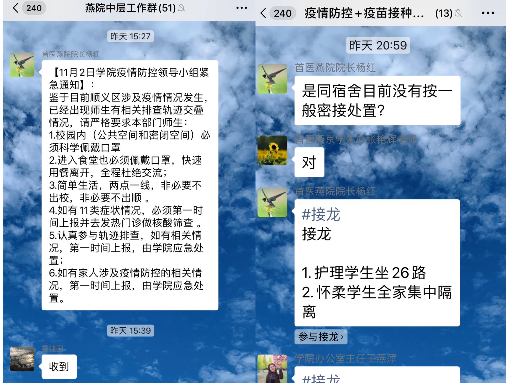 11月2日,北京市新增一起家庭聚集性疫情,两例确诊病例活动轨迹涉及顺义区双河大街北京汽车产业研发基地和部分公交车路线。截至11月2日18时,顺义区疾控中心流调组累计判定密接454人,次密440人。我院迅速启动应急响应,第一时间组织中层干部向全院师生员工发布6条紧急提醒,并连夜开展疫情防控摸排工作。