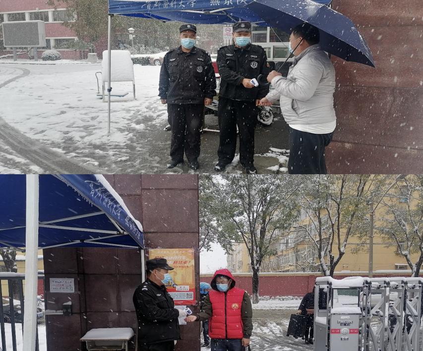 wepoker德州 保卫人员不畏严寒大雪天气,依然坚守工作岗位,严格落实“五个一”(测温、戴口罩、健康码、行程码、一米线)检查措施,对进出人员、车辆进行登记,守好校园疫情防控大门。