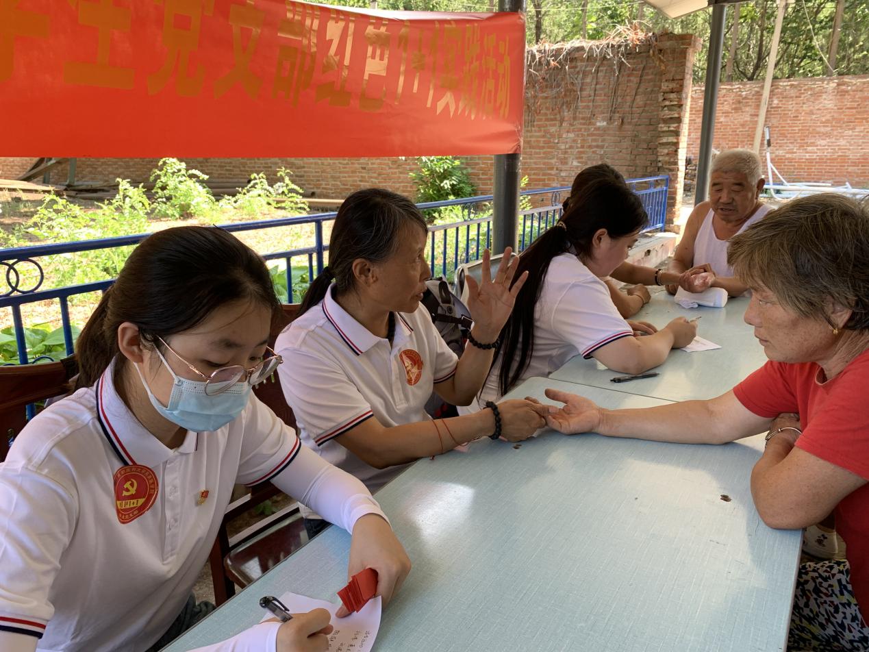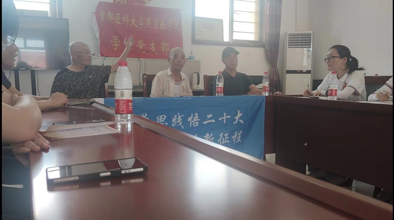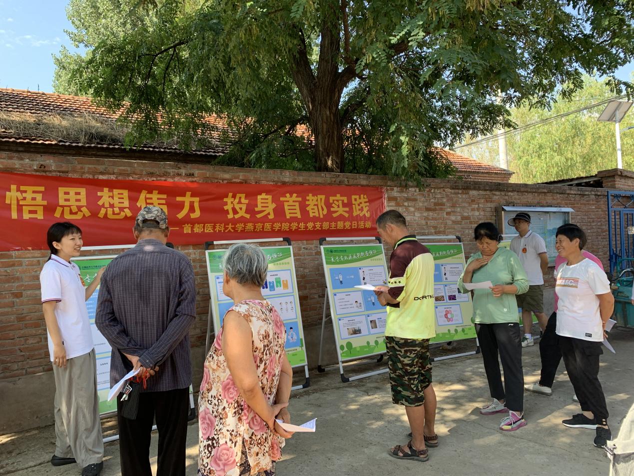本次主题党日活动前期进行了充分沟通,安排了健康知识宣讲、中医理疗和义诊、访谈村党支部老党员和走访村卫生室等活。学生党支部26名学生党员分别承担健康知识宣讲、海报制作、物资准备、现场组织、村民健康信息收集等工作。经过了多日的精心策划和准备,7月11日上午,在山里辛庄村委会大院,活动在村民们的期待中火热开展。学生党员程序、赵浩然承担了健康知识宣讲的任务,他们充分调动自身专业知识,结合搜集的资料,向村民科普夏季常见病的判断与预防,并结合村庄居民的构成特点,普及老年人、幼童和慢病患者健康照护的注意事项,讲解中充分的互动吸引了村民们的注意力,活动效果初显。义诊活动受到了村民的广泛欢迎,参加实践的中医师毕老师和理疗师李老师带领临床医学专业与护理专业的同学开展了义诊活动。学生党员们收集现场村民的身高、体重、血压、既往病史等基础信息并制作表格,引导村民们有序排队进行中医诊疗和体验理疗保健,参加义诊的村民还获得了我们精心准备的用于日常生活应急的医疗资源包。虽然骄阳似火,却丝毫没有挡住村民参与活动的热情。从早上8点半直到中11点半,村中的中老年人、儿童和带幼儿的妈妈,陆陆续续约八十人次来到活动现场咨询、学习、参加义诊和体验。这样的场面使团队师生大受感动并深深地体会到:在基层,在农村,人们对健康和医疗卫生的渴求与期待。在感动中,大家渐渐感到作为一名医学生的责任之重。参与活动的村民们忍不住赞叹到:“你们这个活动太棒了,欢迎你们再来!” 一位坐轮椅前来参与活动的爷爷深受感动真诚地说到:“共产党好,为人民考虑,你们这些孩子大热天也不容易,多注点意不要中暑!”