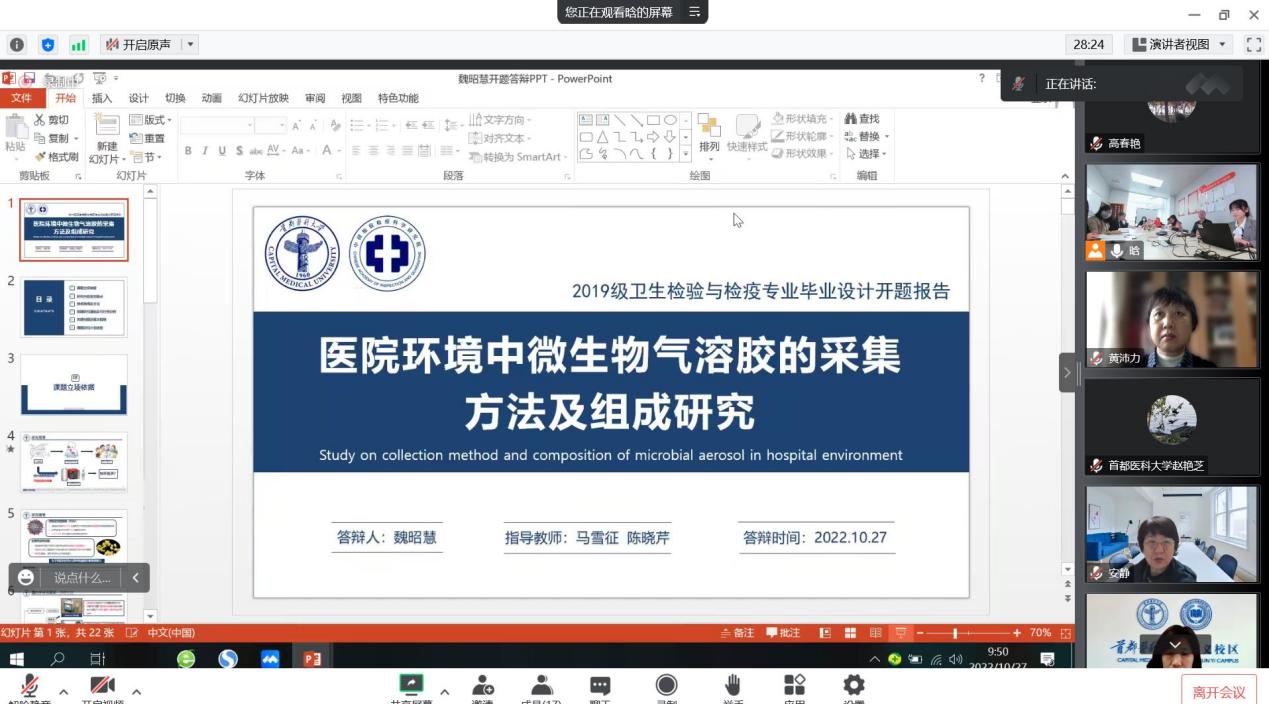 我院院长杨红教授、党委副书记赵艳芝副教授、基础医wepoker德州 安静教授、公共卫生wepoker德州 黄沛力教授、我院王宇教授、中国检验检疫科学研究所长胡孔新研究员、中国海关科学技术研究中心卫生检疫研究所所长张晓龙研究员、食品安全研究所所长秦士忠研究员、北京疾病预防控制中心陈倩主任技师、刘美德副研究员、实践教学基地和检验学学系的毕业设计指导教师、开题秘书出席开题报告会。