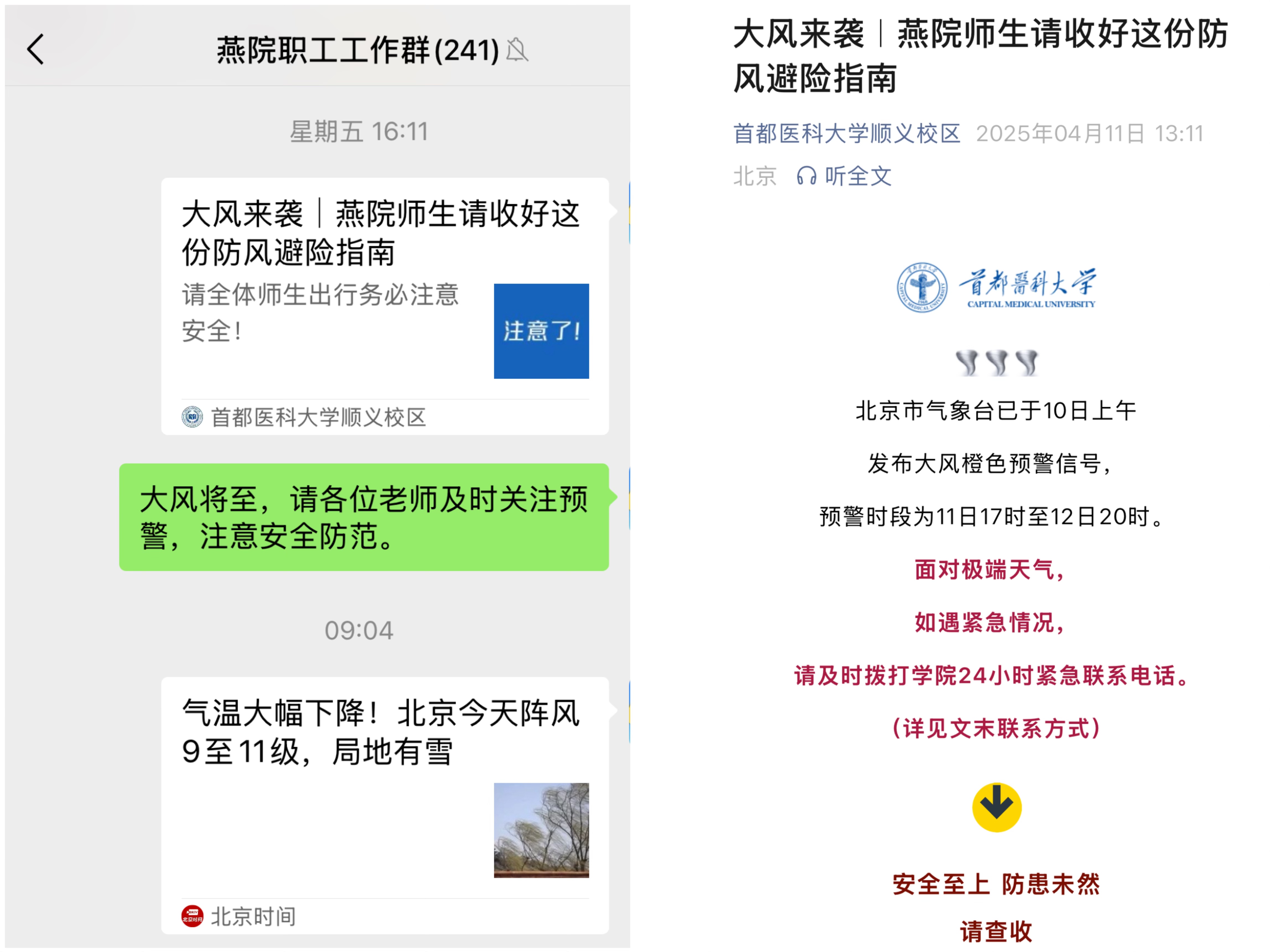 wepoker德州 通过官方微信公众号、师生联络群等多渠道联动机制,第一时间向全院师生精准推送气象部门发布的预警信息,提醒师生在大风等极端天气条件下及时关好门窗,增强安全防范意识,建议非必要不外出,切实做好个人防护工作。