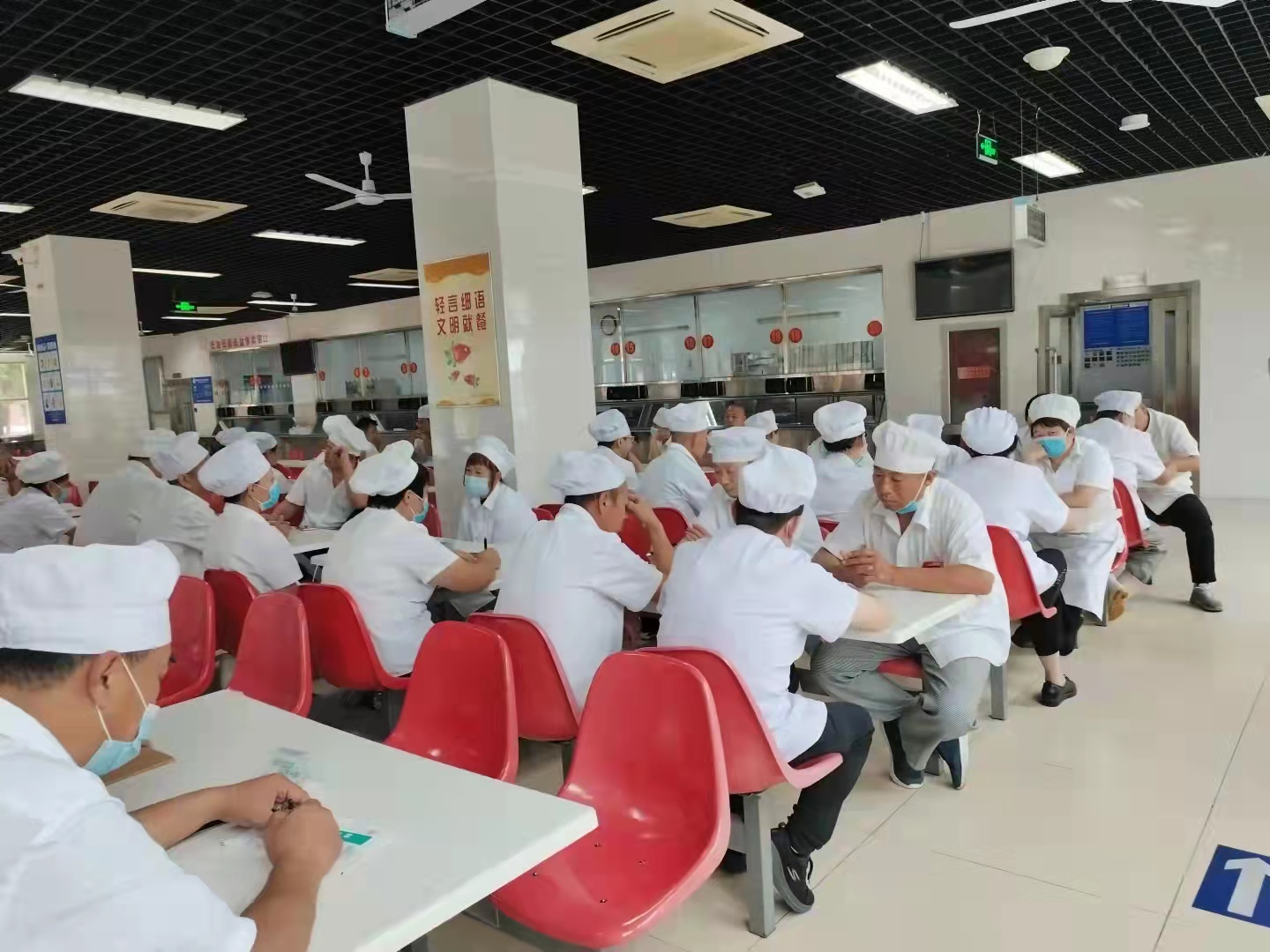 二是做好人员保障工作。军训期间工作人员早晨4点到岗,晚上宵夜21点结束,工作时间延长,工作强度也大大增加。军训前食堂对所有员工进行动员,确保所有人员以最好的精神状态完成这次任务。