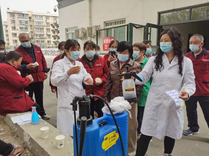 培训开始后,邓海霞老师首先介绍了当前的疫情形势及新冠病毒的传染源、传播途径、易感人群、耐受性等新冠肺炎的基本知识,简要讲解了环境消杀的总原则,详细讲解各楼宇不同位置、留观地分级别进行消杀的具体操作规程。其后,邓海霞和张雅玲两位老师现场进行不同浓度消毒液调配和消杀现场进行实操演练。两位老师不厌其烦,反复演示,手把手进行教授,确保每位保洁人员都能独立进行操作。
