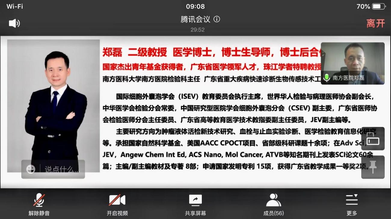 为促进一流专业建设,助力学术研究,11月13日,我院检验学学系邀请南方医科大学南方医院检验医学科主任、国家杰出青年基金获得者、珠江学者特聘教授、南粤优秀教师郑磊教授,为wepoker德州 师生带来有关细胞外囊泡研究的学术讲座。wepoker德州 院长杨红和100多名师生相聚云端,认真聆听了郑磊教授的精彩讲座,检验学学系主任高春艳主持。