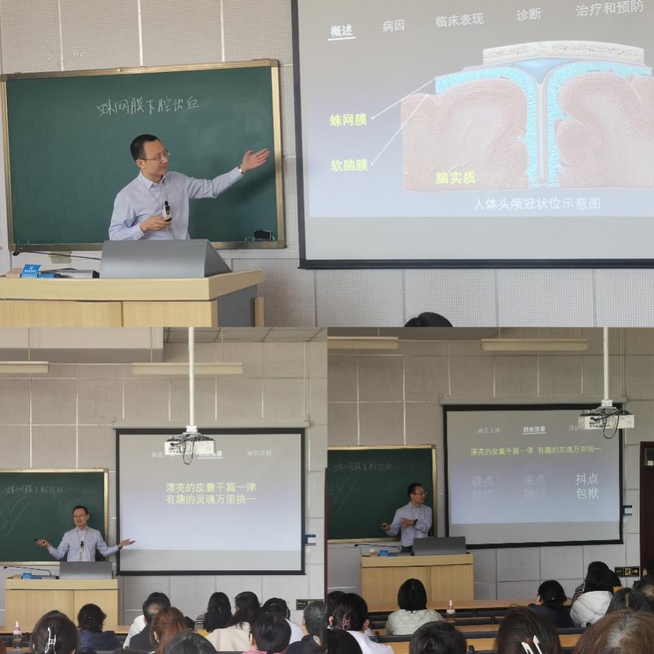 随后,吴川杰老师为大家做了题为《出血性脑血管病-蛛网膜下腔出血》的教学示范,并依据亲身经历做了青教赛参赛经验分享,在交流互动环节,与会教师就自身在讲课选题、教案设计、课件制作、教学演示等环节与吴川杰老师进行了交流。吴川杰老师的经验分享内容丰富、语言幽默风趣,与会老师纷纷表示受益良多。