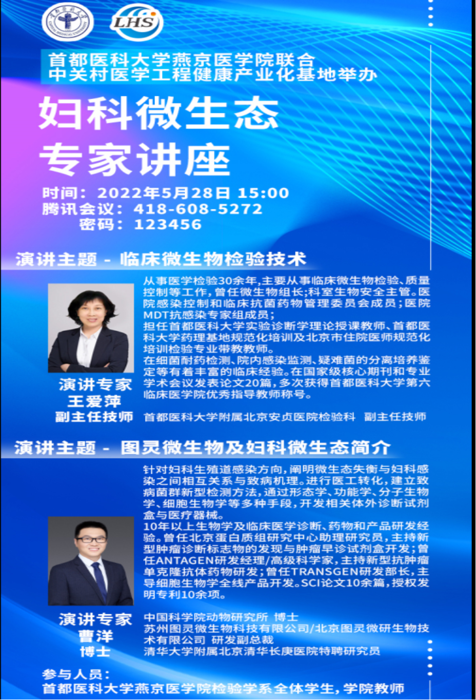 5月28日下午,检验学学系邀请我校附属安贞医院检验科副主任技师王爱萍老师和中国科wepoker德州 动物研究所博士,清华大学附属北京清华长庚医院特聘研究员曹洋博士做了“妇科微生态”专题讲座。讲座由检验学学系主任高春艳老师主持,检验学学系全体师生及其他学系教师180余人参会。