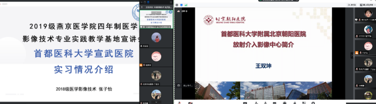 北京同仁医院牛延涛主任及刘丹丹老师介绍了基地情况,2018级医学影像技术班的柴子涵介绍了自己在北京同仁实践教学基地的实习情况,她从普放、CT、MRI和介入的临床实习工作内容、培训和学习的内容、阶段性考核的相关事宜、毕业设计和毕业后的一些方向等多项内容进行了分享。
