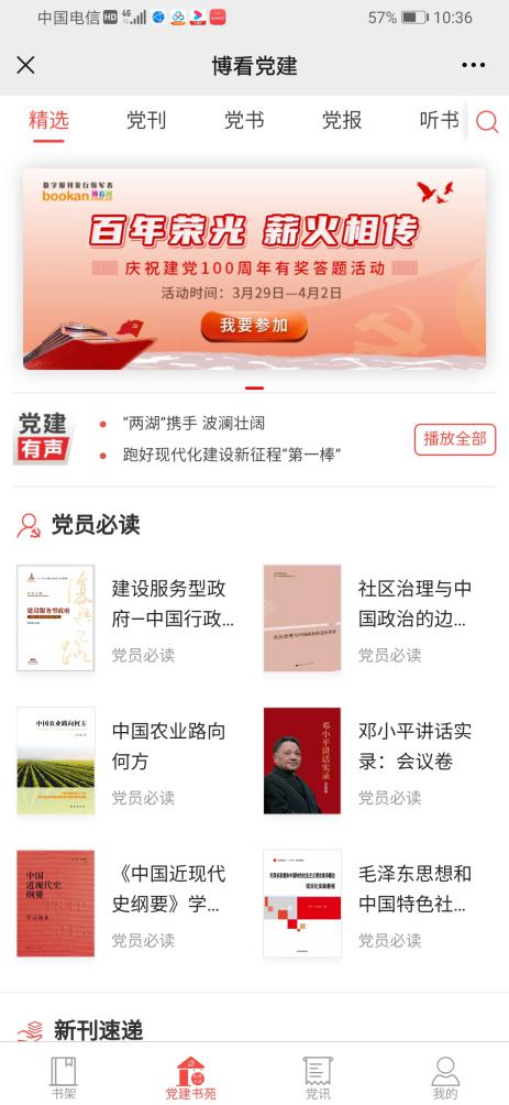 2、点击底部菜单栏“***”—“***”,进入博看党建云阅读平台,点击wepoker德州活动轮播图,进入活动页面浏览党的百年历程大事件,点亮有奖答题活动入口,参与线上知识竞答。