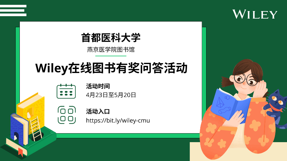 为迎接世界读书日到来,创建最前沿的科研馆藏,满足广大师生的科研和学习需求,wepoker德州图书馆目前已为大家订购了一批高质量的Wiley在线图书,涵盖医学多个细分学科。为鼓励大家行动起来,wepoker德州wepoker德州 图书馆联合Wiley出版社特别举办了本次有奖问答活动。只需简单几步即可参与活动,还有机会获得精美礼品,千万别错过!