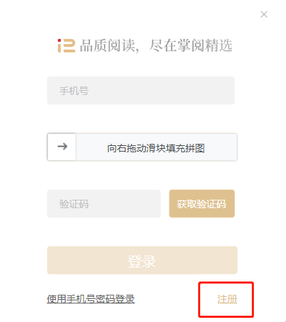 从//se.zhangyue.com/channel/index?appId=507a6bf7进入【掌阅精选】,点击右上角【登录】,在弹框中,点击【注册】,用手机号验证码,注册专属免费阅读账号。